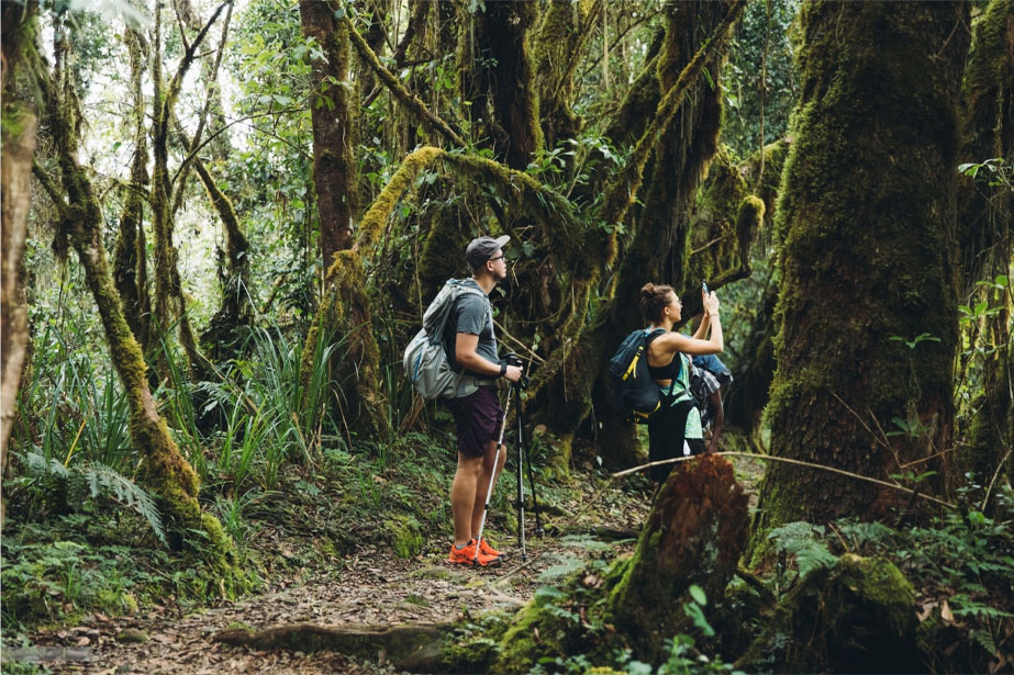 After breakfast, we drive to the Marangu Gate (6,046 ft). The trek begins through the lush, misty montane rainforest. The path is well-graded, setting a comfortable, steady pace for the first day. We arrive at Mandara Hut (8,858 ft), located right on the edge of the forest, where you can settle into your unique hut accommodation (dormitory-style).
